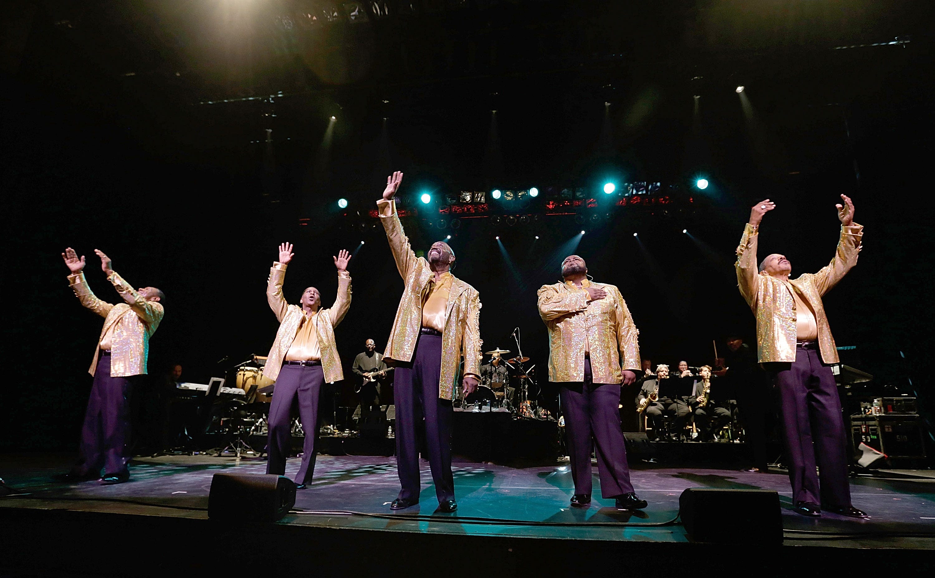 Bruce Williamson, en el centro, y Otis Williams, a la derecha, de The Temptations actúan para el presidente George W. Bush, sentados, de nuevo a la cámara, en una celebración del Mes de la Historia Afroamericana, martes 12 de febrero de 2008, dentro de la Sala Este de la Casa Blanca en Washington.